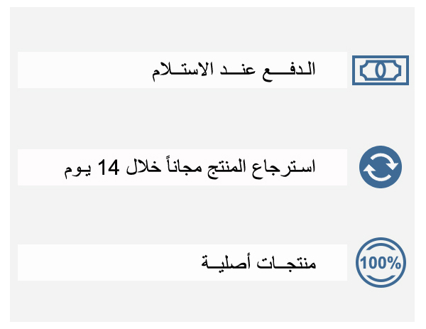 جميع المنتجات التي نروج لها وتصلك عن طريقنا أو عن طريق خدمات الشحن المختلفه التي نتعامل معها يتم اختبار جـودتها قبل شحنها اليك والتأكد من سلامتها بنسبة 100%, ومع ذلك فـأي منتج سيصل لك وتكتشف ان به عيب صناعه بعد استلامه , فكل ما عليك هو التواصل معنا وسنقوم بتوجيهك للخطوات التي يجب عليك اتباعها حتى يتم استبدال المنتج لك او إسترجاعه واسترجاع المبلغ الذي قمت بدفعه كاملاً اليك.